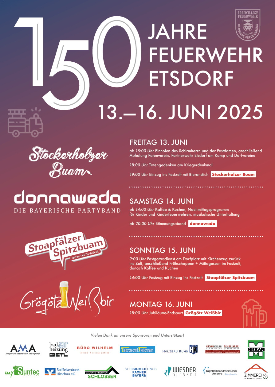 Die Freiwillige Feuerwehr Etsdorf durfte vom 13.-16. Juni ein ganz besonderes Jubiläum feiern: 150 Jahre Einsatz für die Gemeinschaft. Am Festsonntag wurde spürbar, wie tief die Wehr im Dorf verwurzelt ist. Zahlreiche Vereine mit ihren Fahnenabordnungen, viele Gäste aus nah und fern und eine starke Beteiligung aus der Bevölkerung begleiteten den feierlichen Kirchenzug. Nach dem Gottesdienst zog die gesamte Festgemeinschaft weiter zum liebevoll gestalteten Festgelände, wo der Jubiläumstag seinen würdigen Rahmen fand.
